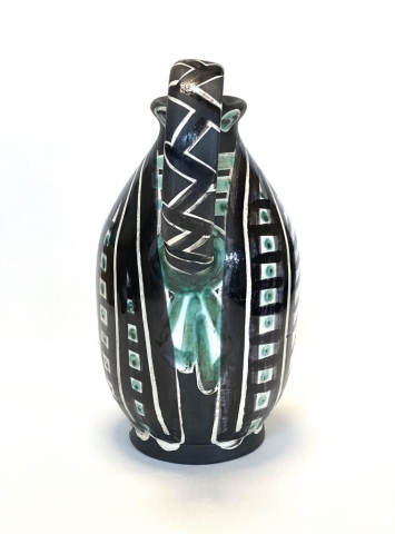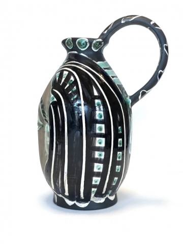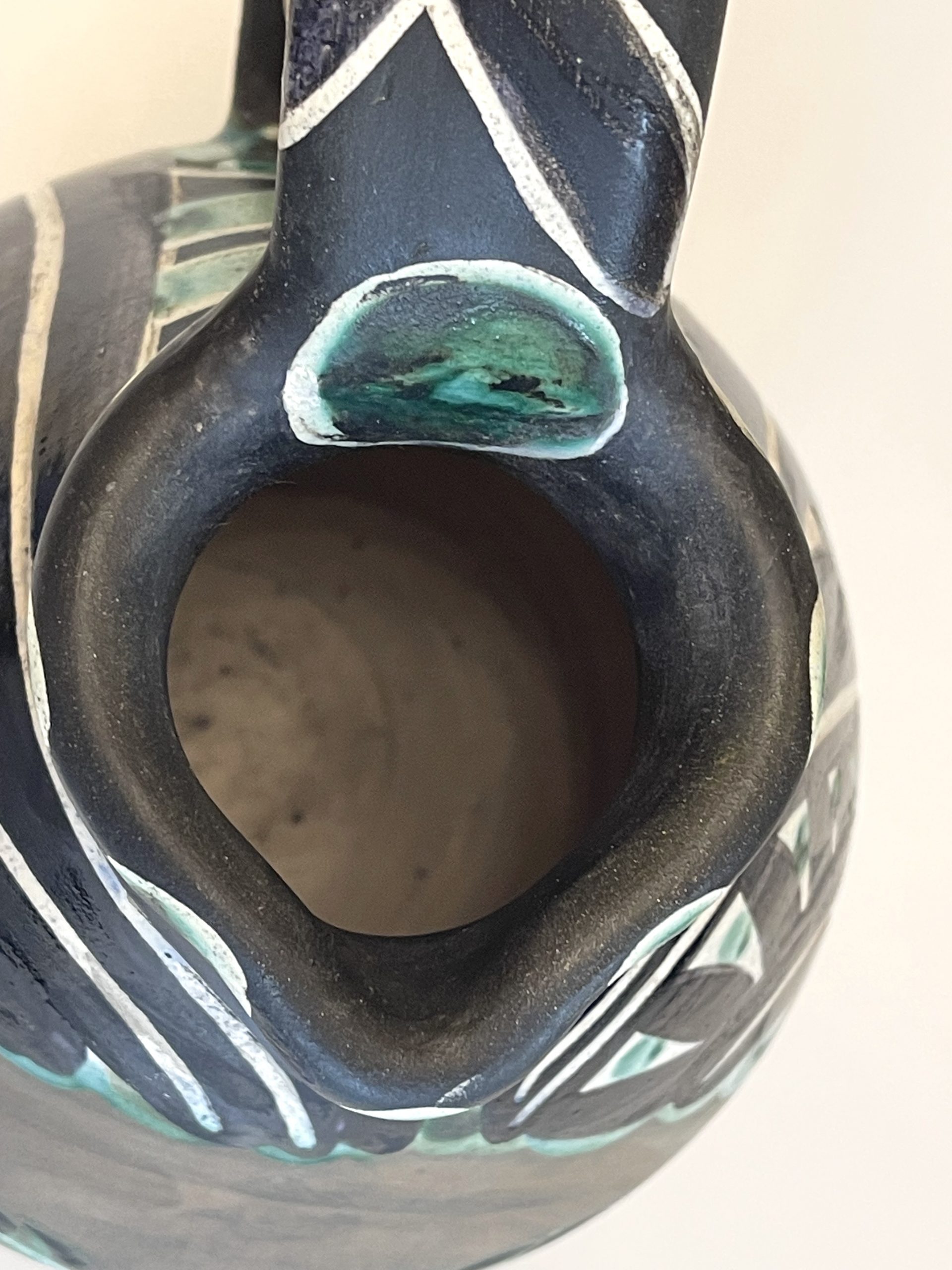 Terre de faience turned pitcher, painted in colored engobes, knife engraved and partially brushed glaze.